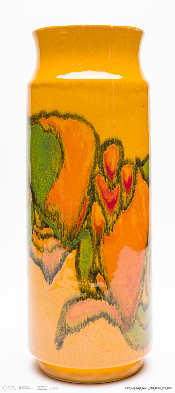 Matéria/Técnica: Barro branco rodado. Vidrado polícromo: preto, verde, vermelho, laranja, amarelo e branco; Cronologia: 1973-1979; Autoria: Tony Morris e Diana Davis / Poole, Inglaterra; Dimensões (cm): Altura: 31,7; Diâmetro: 12,3.