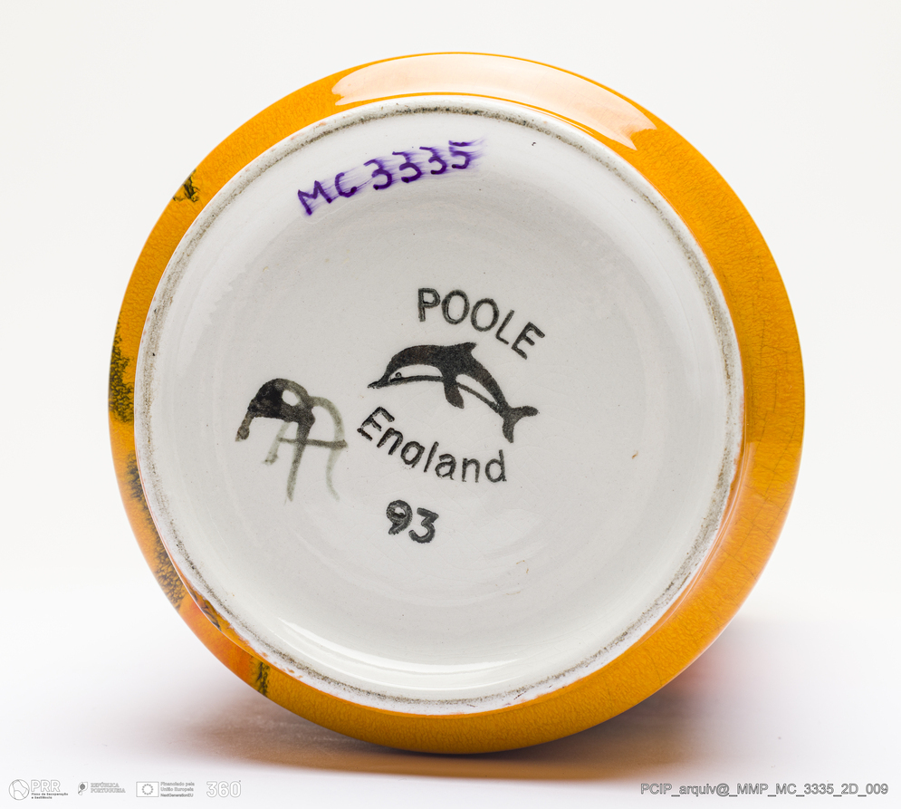 Matéria/Técnica: Barro branco rodado. Vidrado polícromo: preto, verde, vermelho, laranja, amarelo e branco; Cronologia: 1973-1979; Autoria: Tony Morris e Diana Davis / Poole, Inglaterra; Dimensões (cm): Altura: 31,7; Diâmetro: 12,3.