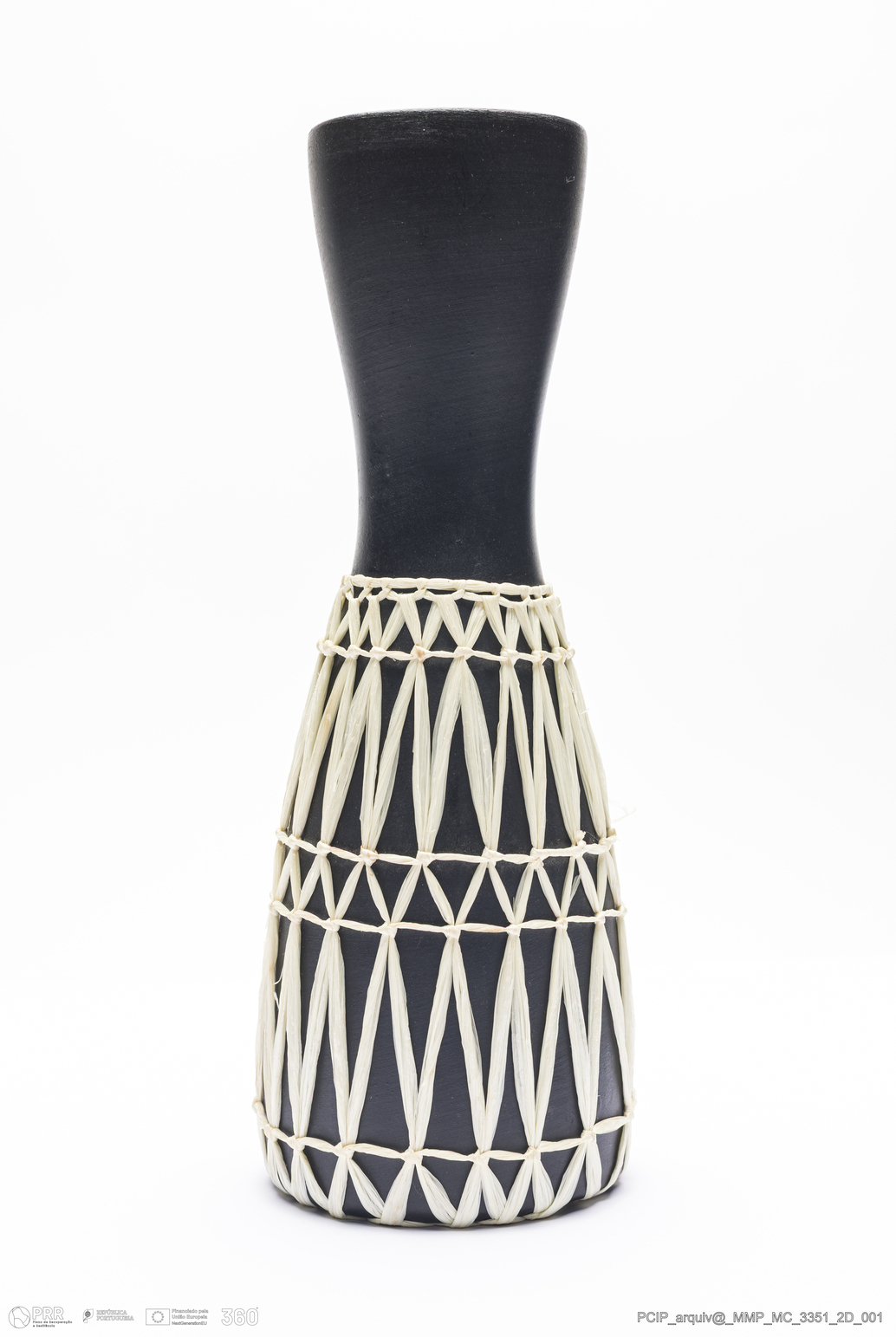Matéria/Técnica: Barro branco rodado. Pintura monocroma preta, a frio, com aplicações de ráfia; Cronologia: Século XX; Autoria: Desconhecido /Áustria; Dimensões (cm): Altura: 25,5; Diâmetro: 8,5.
