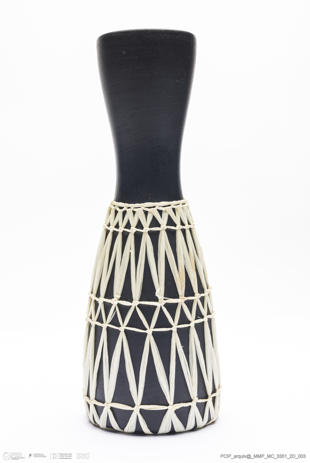 Matéria/Técnica: Barro branco rodado. Pintura monocroma preta, a frio, com aplicações de ráfia; Cronologia: Século XX; Autoria: Desconhecido /Áustria; Dimensões (cm): Altura: 25,5; Diâmetro: 8,5.