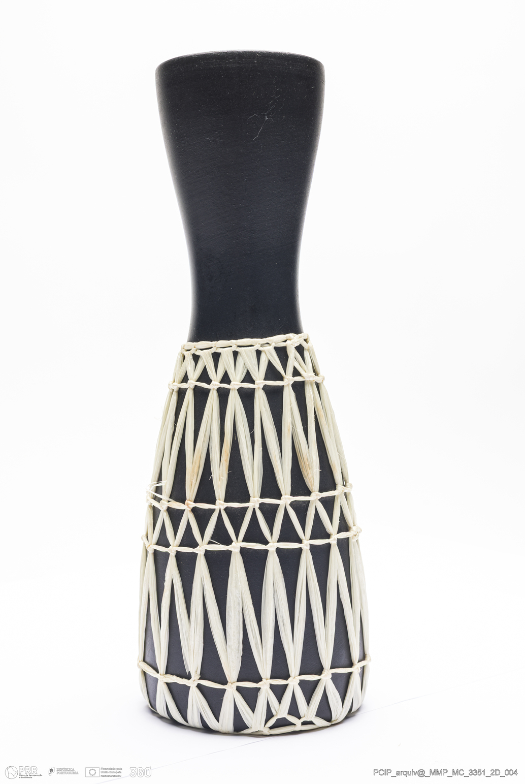 Matéria/Técnica: Barro branco rodado. Pintura monocroma preta, a frio, com aplicações de ráfia; Cronologia: Século XX; Autoria: Desconhecido /Áustria; Dimensões (cm): Altura: 25,5; Diâmetro: 8,5.