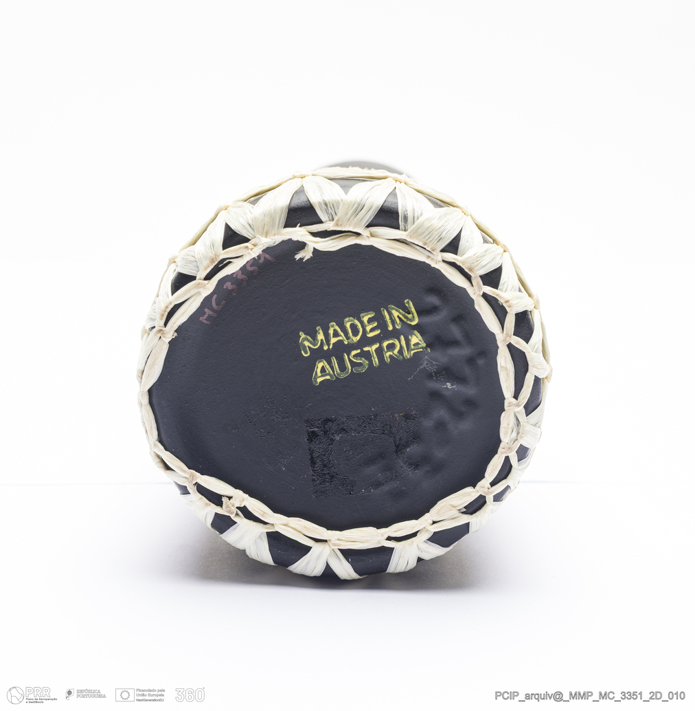Matéria/Técnica: Barro branco rodado. Pintura monocroma preta, a frio, com aplicações de ráfia; Cronologia: Século XX; Autoria: Desconhecido /Áustria; Dimensões (cm): Altura: 25,5; Diâmetro: 8,5.