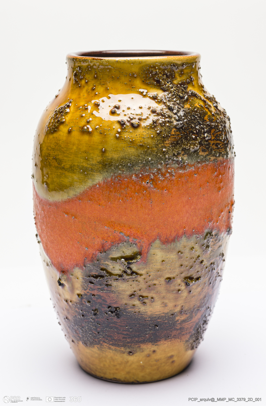 Matéria/Técnica: Barro vermelho moldado. Vidrado polícromo: castanho escuro e mel, laranja; Cronologia: 1960-1970; Autoria: Desconhecido / Scheurich, Alemanha; Dimensões (cm): Altura: 20,6; Diâmetro: 13,3.