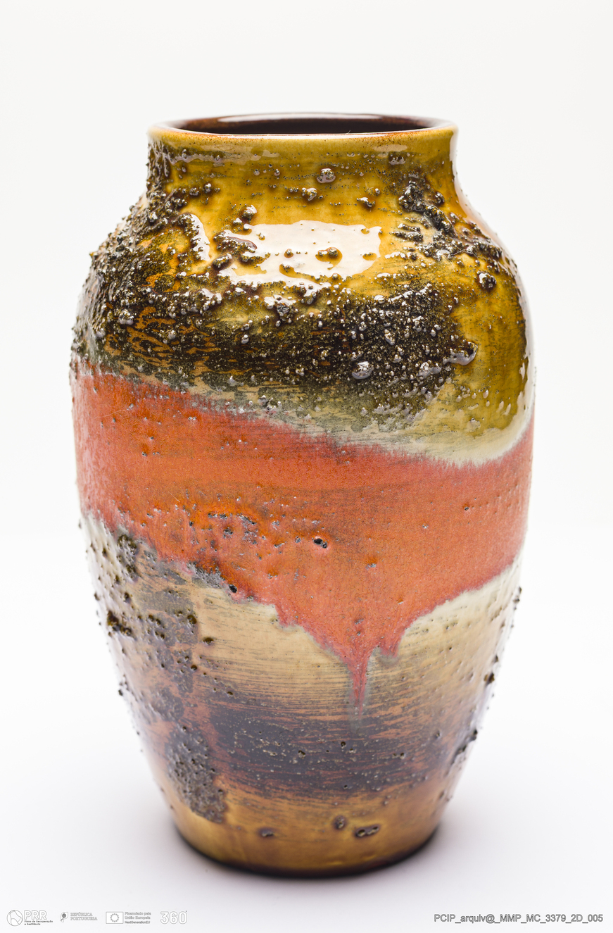 Matéria/Técnica: Barro vermelho moldado. Vidrado polícromo: castanho escuro e mel, laranja; Cronologia: 1960-1970; Autoria: Desconhecido / Scheurich, Alemanha; Dimensões (cm): Altura: 20,6; Diâmetro: 13,3.