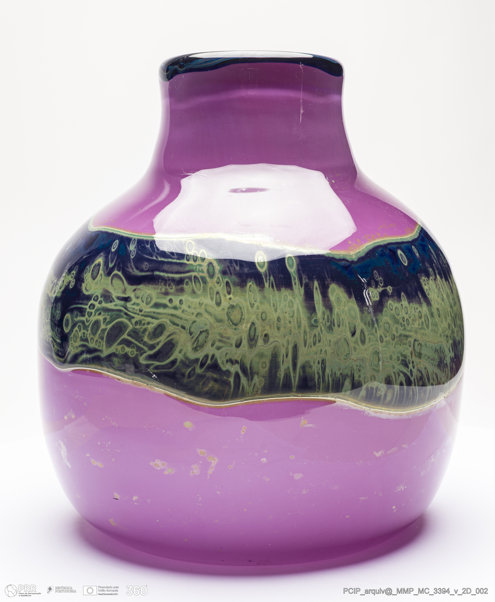 Matéria/Técnica: Vidro roxo com azul e verde; Cronologia: Século XX; Autoria: Assinatura não identificada; Dimensões (cm): Altura: 28,5; Diâmetro: 26,5.