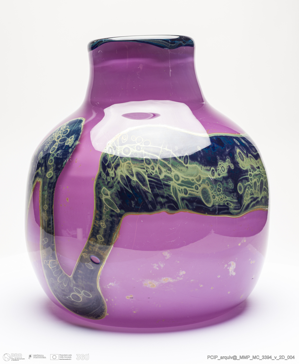 Matéria/Técnica: Vidro roxo com azul e verde; Cronologia: Século XX; Autoria: Assinatura não identificada; Dimensões (cm): Altura: 28,5; Diâmetro: 26,5.