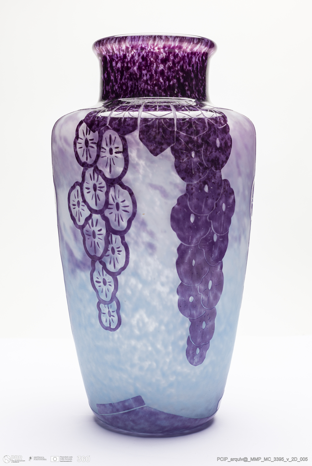 Matéria/Técnica: Vidro transparente com roxo e azul; Cronologia: 1924-1929; Autoria: Charles Schneider / Charder / Ovington, Inglaterra; Dimensões (cm): Altura: 29,5; Diâmetro: 16.