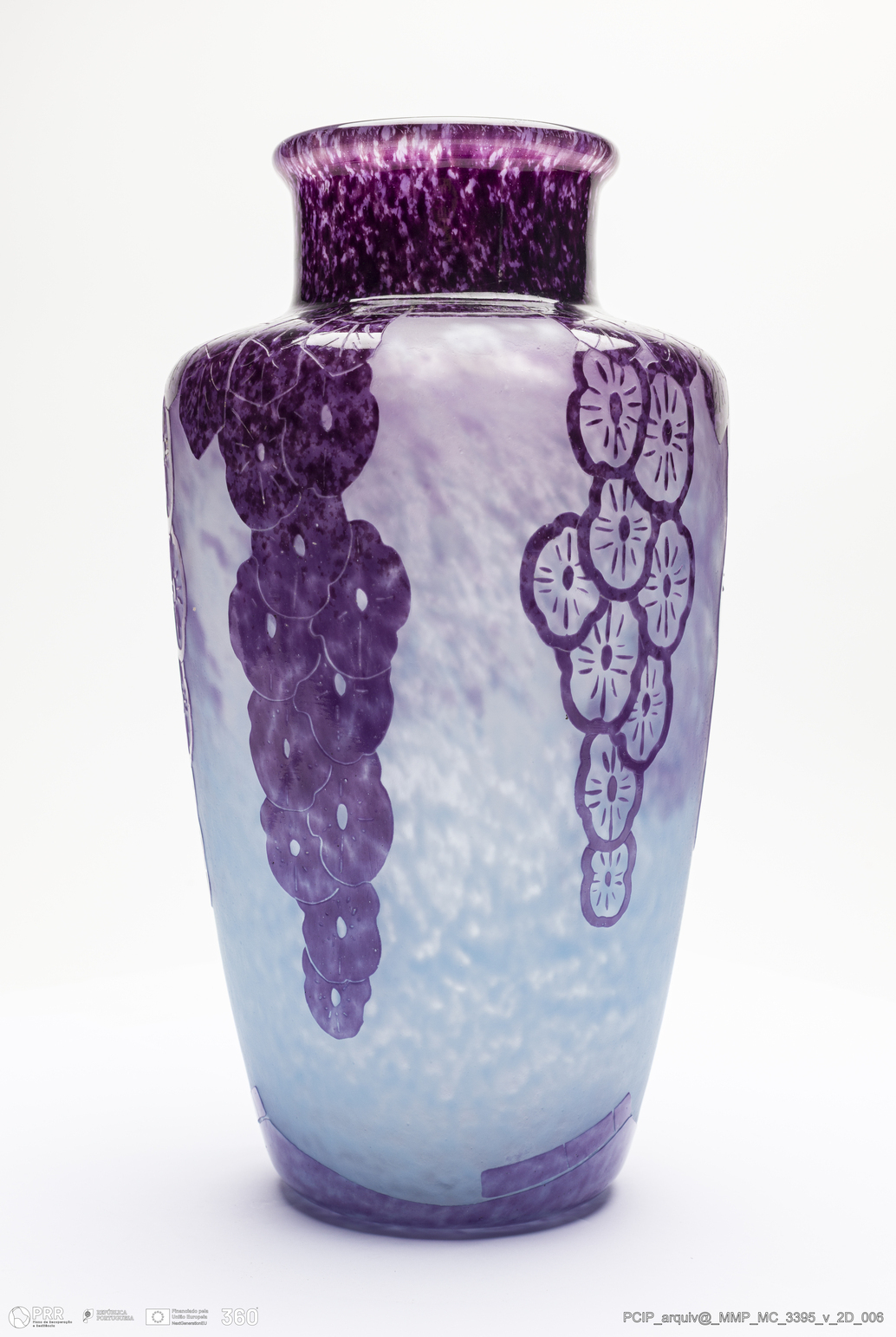 Matéria/Técnica: Vidro transparente com roxo e azul; Cronologia: 1924-1929; Autoria: Charles Schneider / Charder / Ovington, Inglaterra; Dimensões (cm): Altura: 29,5; Diâmetro: 16.