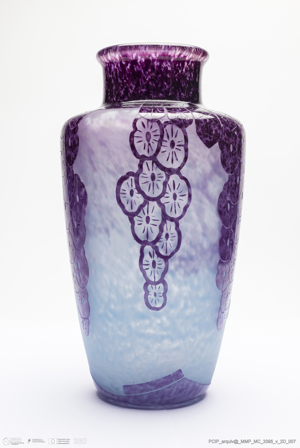 Matéria/Técnica: Vidro transparente com roxo e azul; Cronologia: 1924-1929; Autoria: Charles Schneider / Charder / Ovington, Inglaterra; Dimensões (cm): Altura: 29,5; Diâmetro: 16.