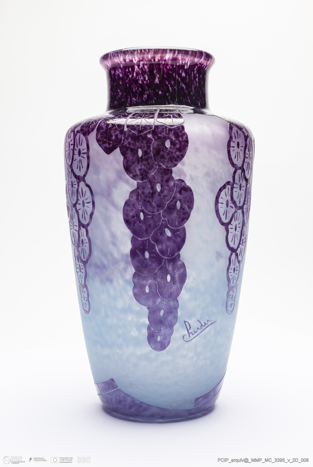 Matéria/Técnica: Vidro transparente com roxo e azul; Cronologia: 1924-1929; Autoria: Charles Schneider / Charder / Ovington, Inglaterra; Dimensões (cm): Altura: 29,5; Diâmetro: 16.