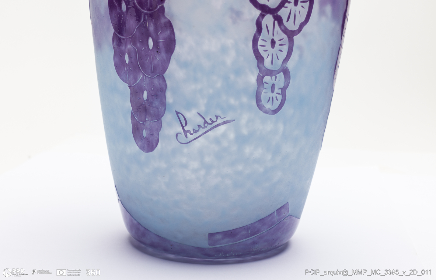 Matéria/Técnica: Vidro transparente com roxo e azul; Cronologia: 1924-1929; Autoria: Charles Schneider / Charder / Ovington, Inglaterra; Dimensões (cm): Altura: 29,5; Diâmetro: 16.