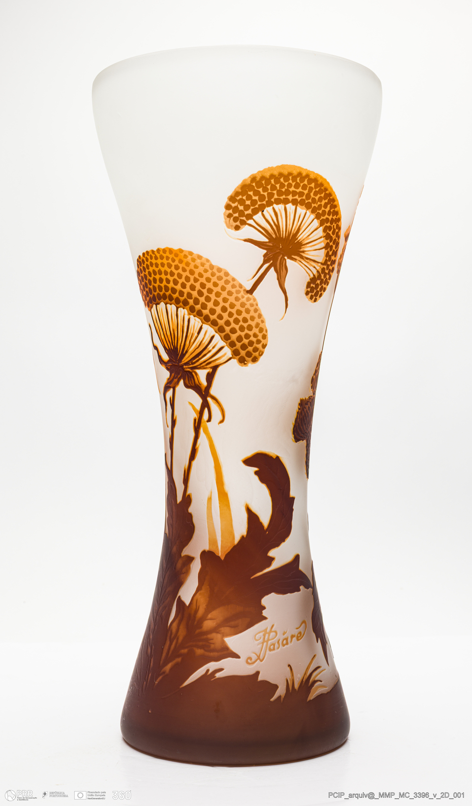 Matéria/Técnica: Vidro transparente com castanho e amarelo; Cronologia: Século XX; Autoria: J. Pasaré / França; Dimensões (cm): Altura: 35; Diâmetro: 15,7.