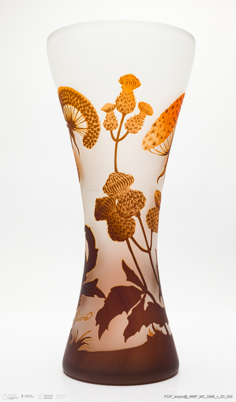 Matéria/Técnica: Vidro transparente com castanho e amarelo; Cronologia: Século XX; Autoria: J. Pasaré / França; Dimensões (cm): Altura: 35; Diâmetro: 15,7.