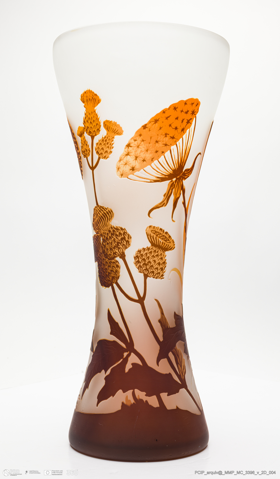 Matéria/Técnica: Vidro transparente com castanho e amarelo; Cronologia: Século XX; Autoria: J. Pasaré / França; Dimensões (cm): Altura: 35; Diâmetro: 15,7.
