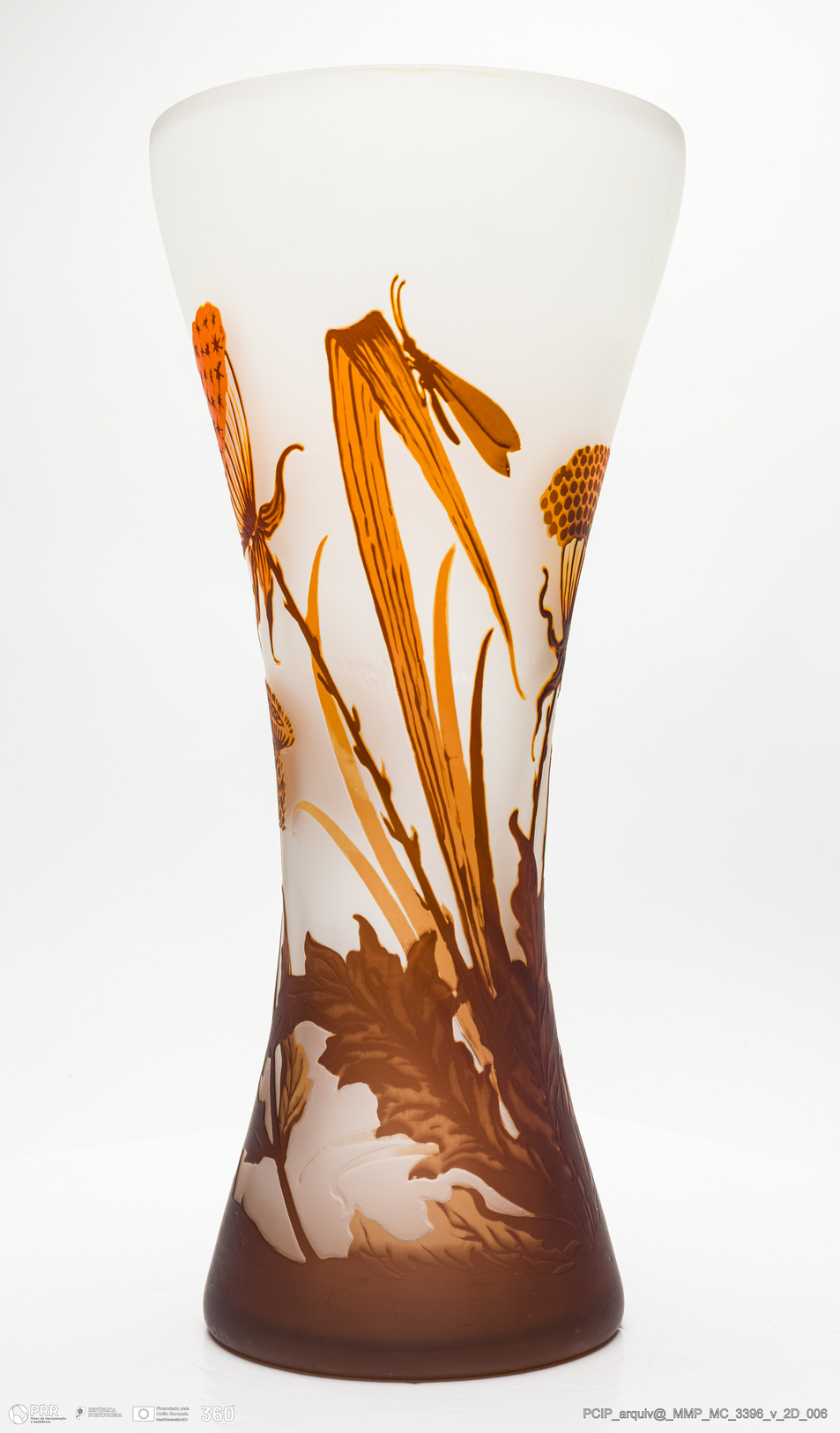Matéria/Técnica: Vidro transparente com castanho e amarelo; Cronologia: Século XX; Autoria: J. Pasaré / França; Dimensões (cm): Altura: 35; Diâmetro: 15,7.