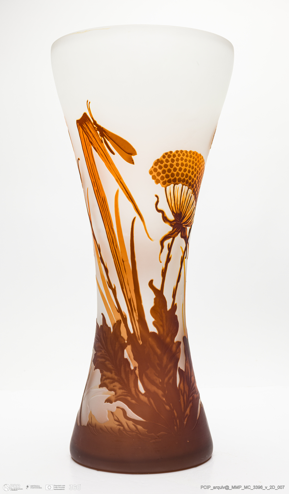 Matéria/Técnica: Vidro transparente com castanho e amarelo; Cronologia: Século XX; Autoria: J. Pasaré / França; Dimensões (cm): Altura: 35; Diâmetro: 15,7.