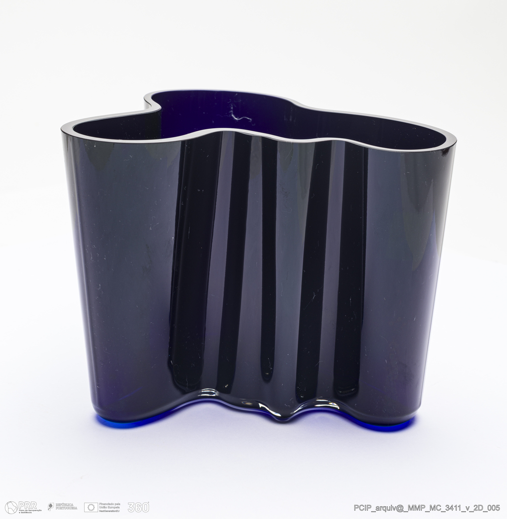 Matéria/Técnica: Vidro azul; Cronologia: Século XX; Autoria: Alvar Aalto / Iittala / Finlândia; Dimensões (cm): Altura: 11,7; Largura: 14; Comprimento: 15,3.