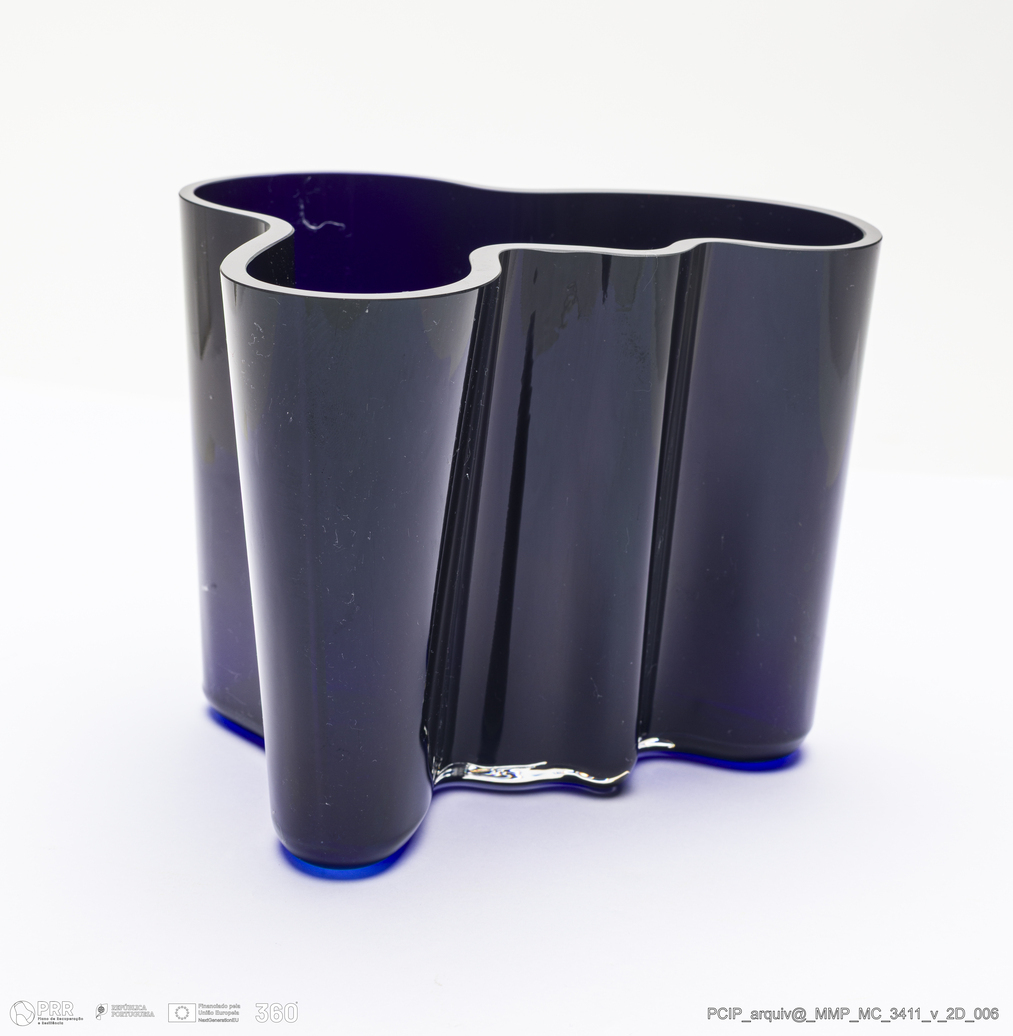 Matéria/Técnica: Vidro azul; Cronologia: Século XX; Autoria: Alvar Aalto / Iittala / Finlândia; Dimensões (cm): Altura: 11,7; Largura: 14; Comprimento: 15,3.