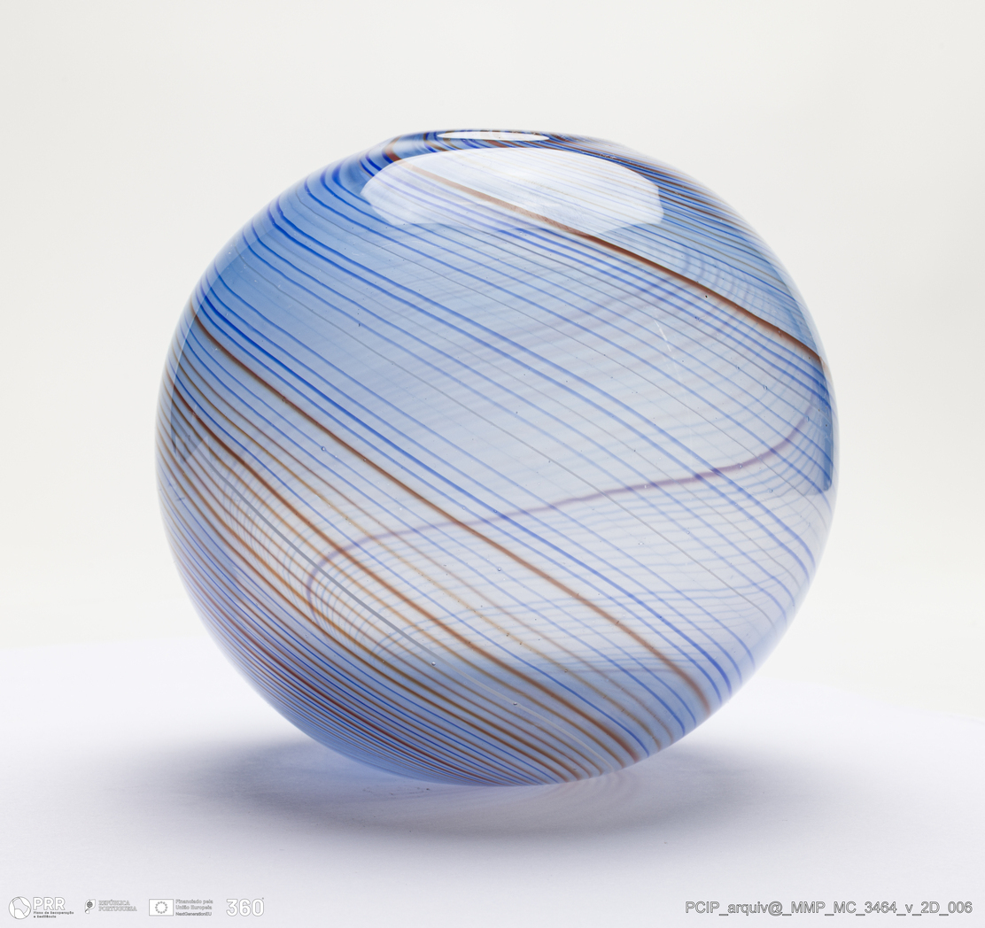 Matéria/Técnica: Vidro azul claro com azul escuro, castanho escuro e mel; Cronologia: Século XX; Autoria: Desconhecido / Murano, Itália; Dimensões (cm): Altura: 13,2; Diâmetro: 13.