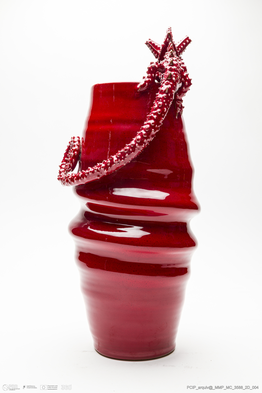 Matéria/Técnica: Barro vermelho rodado e modelado. Vidrado monocromo vermelho; Cronologia: século XX; Autoria: Mirta Morigi / Faenza, Itália; Dimensões (cm): Altura: 43; Diâmetro: 27,5.