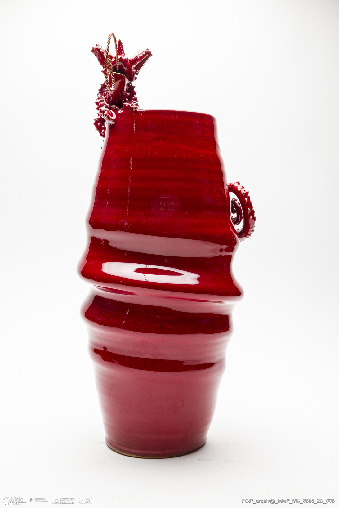 Matéria/Técnica: Barro vermelho rodado e modelado. Vidrado monocromo vermelho; Cronologia: século XX; Autoria: Mirta Morigi / Faenza, Itália; Dimensões (cm): Altura: 43; Diâmetro: 27,5.
