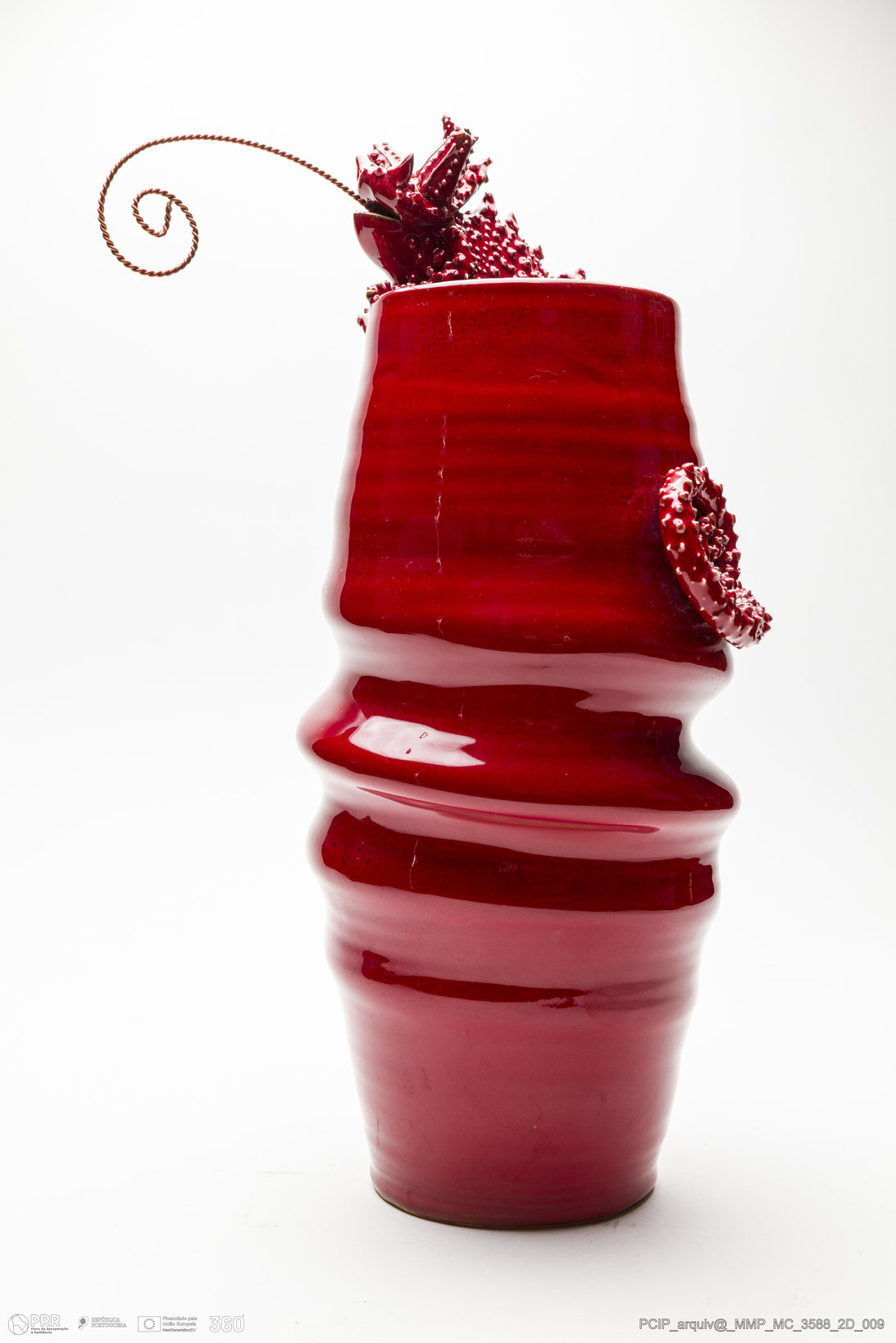 Matéria/Técnica: Barro vermelho rodado e modelado. Vidrado monocromo vermelho; Cronologia: século XX; Autoria: Mirta Morigi / Faenza, Itália; Dimensões (cm): Altura: 43; Diâmetro: 27,5.