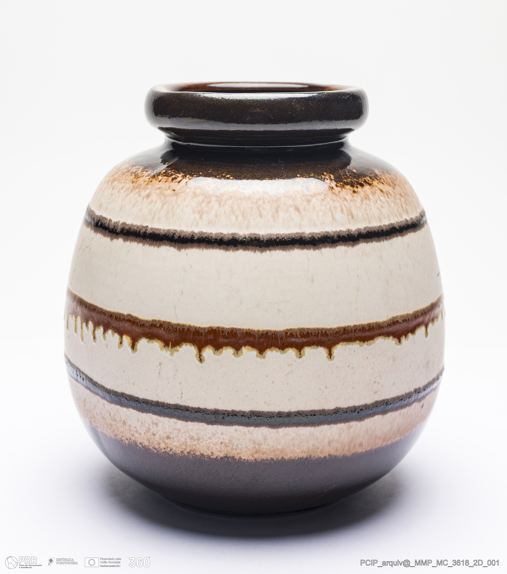 Matéria/Técnica: Barro branco rodado. Vidrado polícromo: castanho escuro e mel. Vidrado polícromo mate: castanho e beje; Cronologia: 1960-1970; Autoria: Desconhecido / Scheurich, Alemanha; Dimensões (cm): Altura: 19; Diâmetro: 17,5.