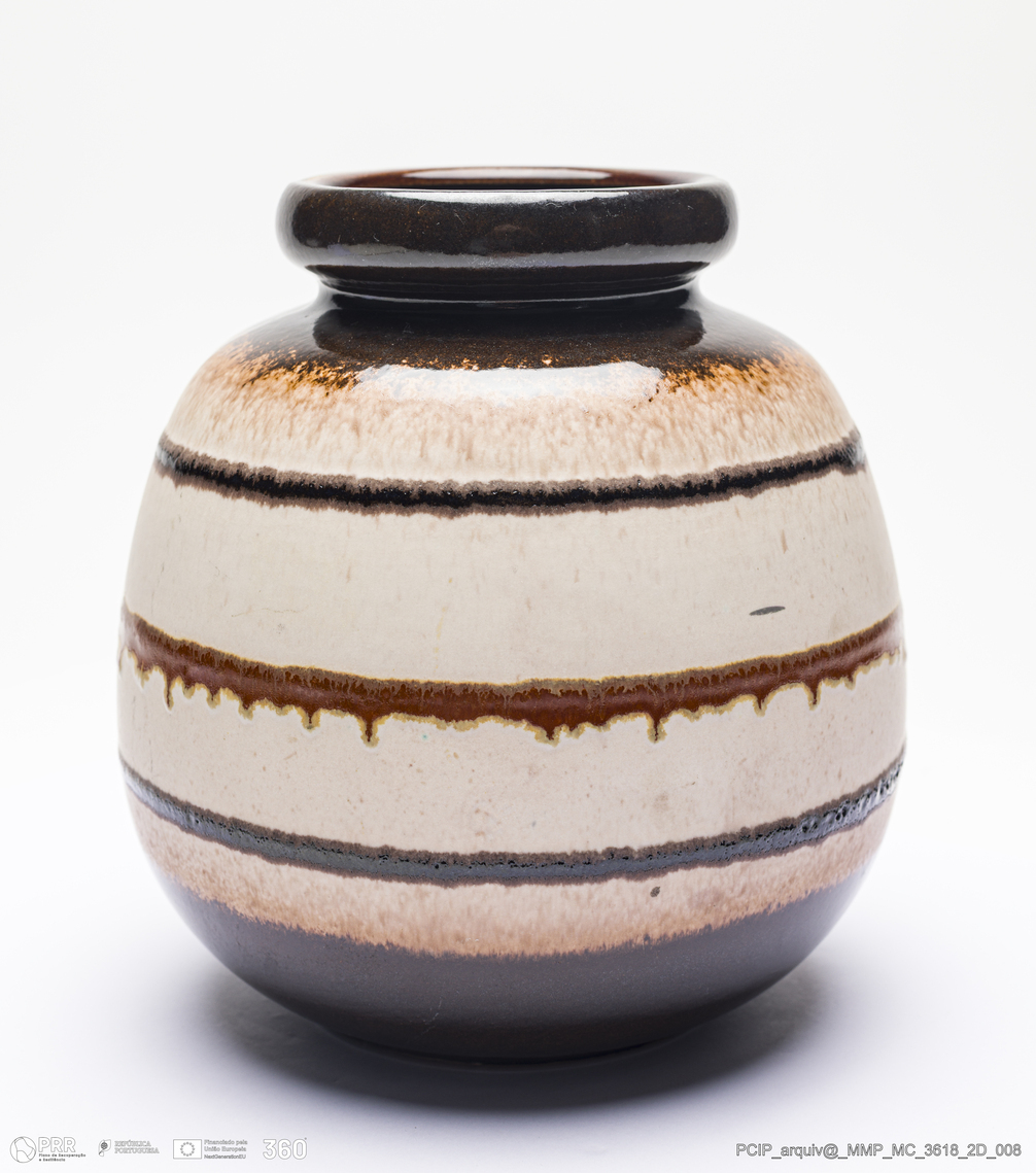 Matéria/Técnica: Barro branco rodado. Vidrado polícromo: castanho escuro e mel. Vidrado polícromo mate: castanho e beje; Cronologia: 1960-1970; Autoria: Desconhecido / Scheurich, Alemanha; Dimensões (cm): Altura: 19; Diâmetro: 17,5.