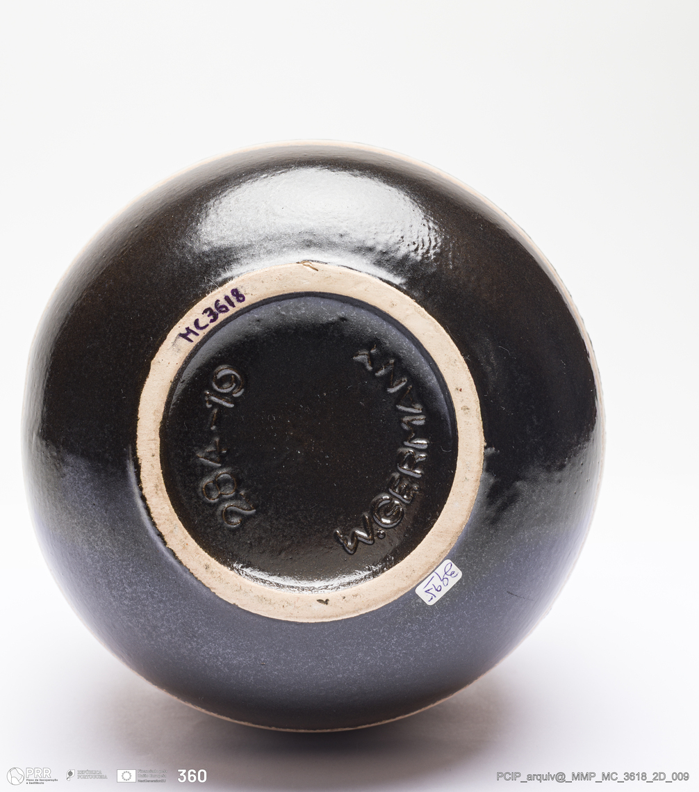 Matéria/Técnica: Barro branco rodado. Vidrado polícromo: castanho escuro e mel. Vidrado polícromo mate: castanho e beje; Cronologia: 1960-1970; Autoria: Desconhecido / Scheurich, Alemanha; Dimensões (cm): Altura: 19; Diâmetro: 17,5.