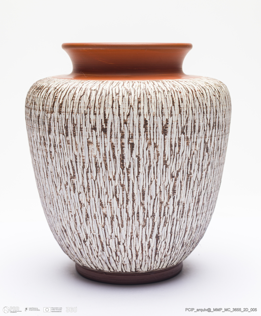 Matéria/Técnica: Barro vermelho rodado. Vidrado polícromo mate: castanho, vermelho e branco; Cronologia: 1960-1970; Autoria: Desconhecido / Scheurich, Alemanha; Dimensões (cm): Altura: 15; Diâmetro: 13.