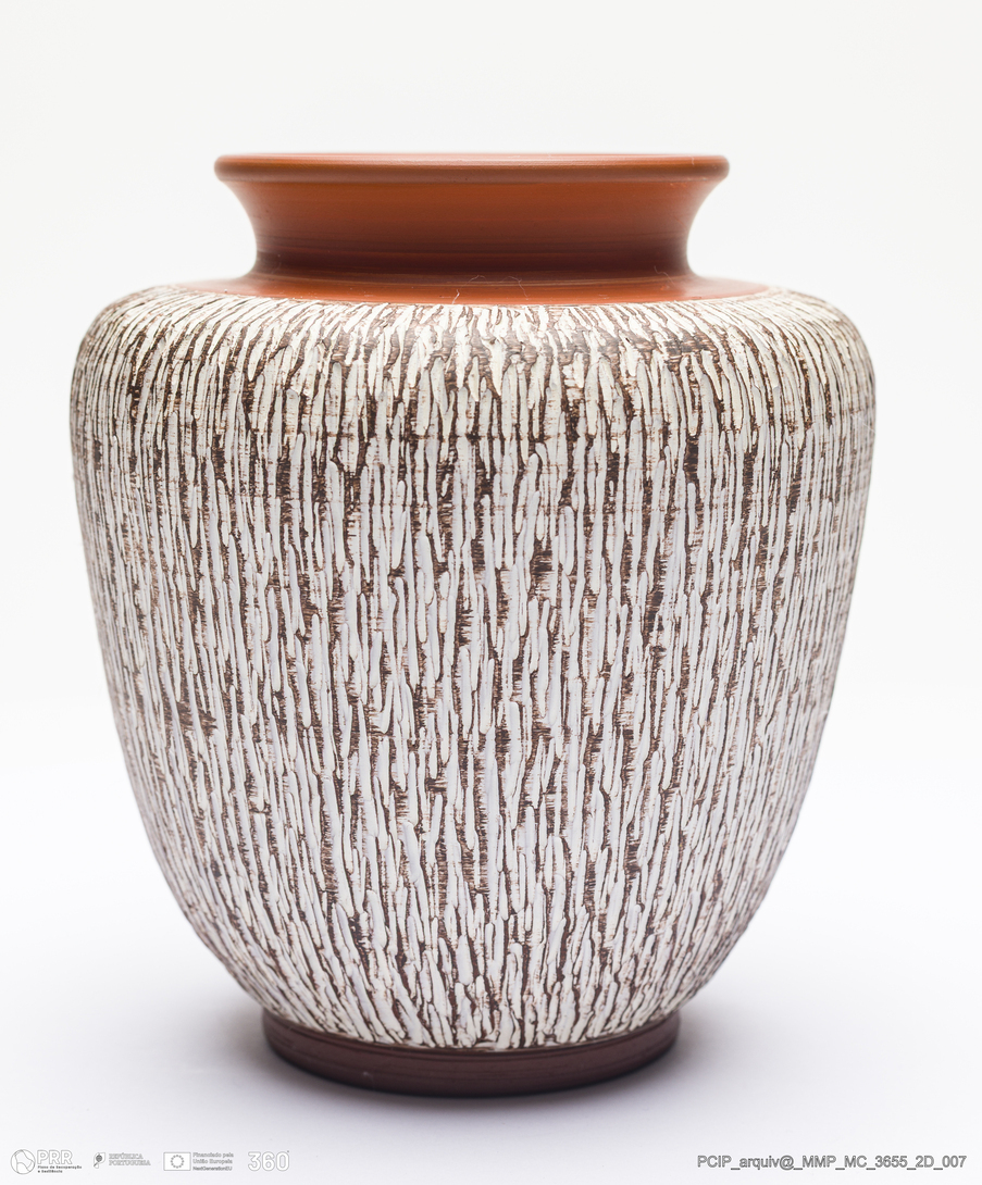 Matéria/Técnica: Barro vermelho rodado. Vidrado polícromo mate: castanho, vermelho e branco; Cronologia: 1960-1970; Autoria: Desconhecido / Scheurich, Alemanha; Dimensões (cm): Altura: 15; Diâmetro: 13.