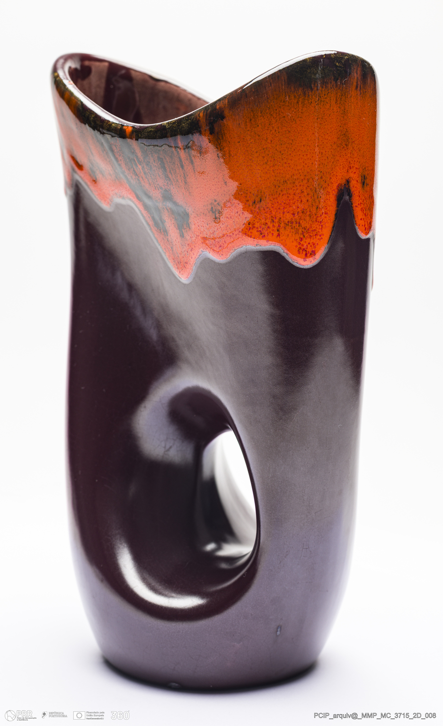 Matéria/Técnica: Barro vermelho moldado. Vidrado polícromo: castanho e vermelho; Cronologia: século XX; Autoria: Desconhecido / Canadá; Dimensões (cm): Altura: 25,5; Largura: 11; Comprimento: 14,5.