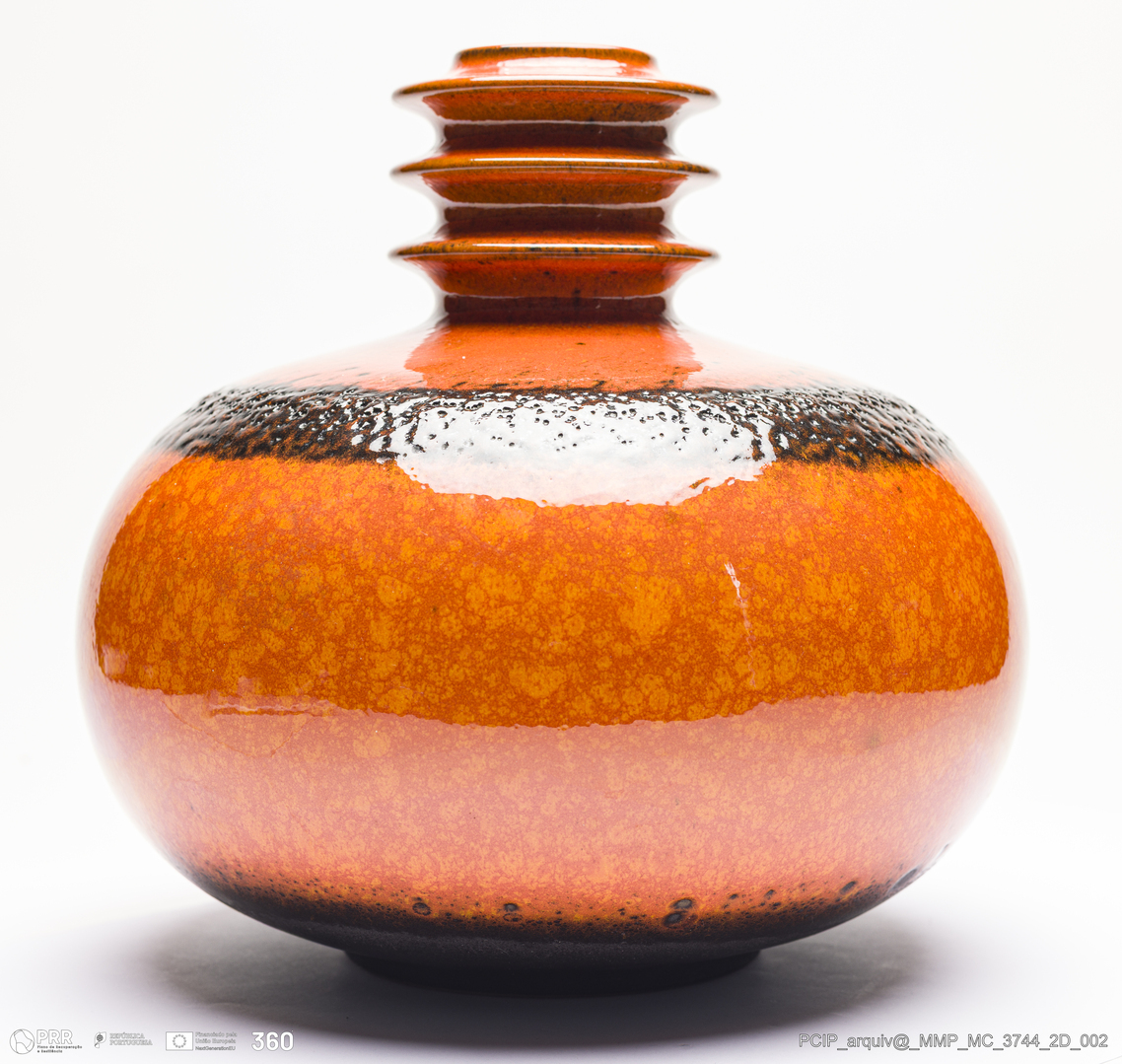 Matéria/Técnica: Barro vermelho moldado. Vidrado polícromo: preto e laranja; Cronologia: 1945-1984; Autoria: Desconhecido / Carstens, Alemanha; Dimensões (cm): Altura: 25,8; Diâmetro: 26.