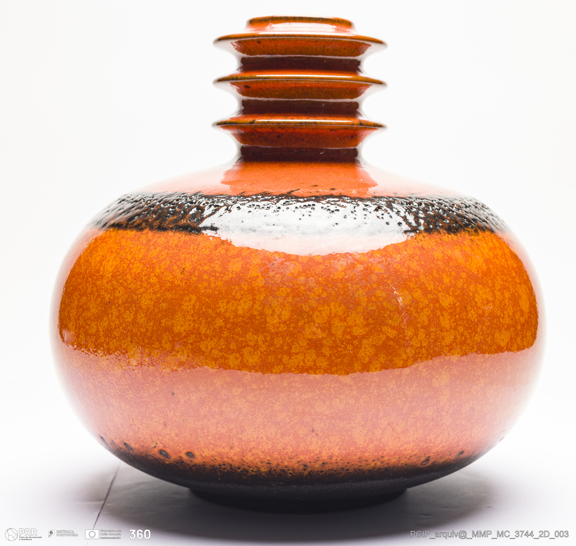 Matéria/Técnica: Barro vermelho moldado. Vidrado polícromo: preto e laranja; Cronologia: 1945-1984; Autoria: Desconhecido / Carstens, Alemanha; Dimensões (cm): Altura: 25,8; Diâmetro: 26.