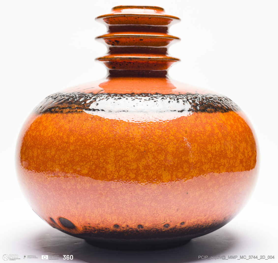 Matéria/Técnica: Barro vermelho moldado. Vidrado polícromo: preto e laranja; Cronologia: 1945-1984; Autoria: Desconhecido / Carstens, Alemanha; Dimensões (cm): Altura: 25,8; Diâmetro: 26.