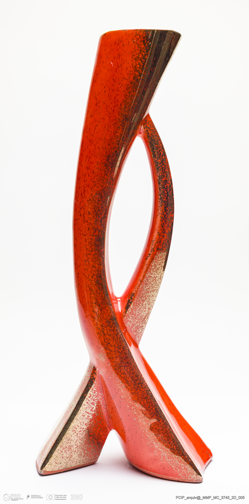 Matéria/Técnica: Barro branco moldado. Vidrado polícromo: vermelho e dourado; Cronologia: século XX; Autoria: Desconhecido / Estados Unidos; Dimensões (cm): Altura: 42; Largura: 12; Comprimento: 17.