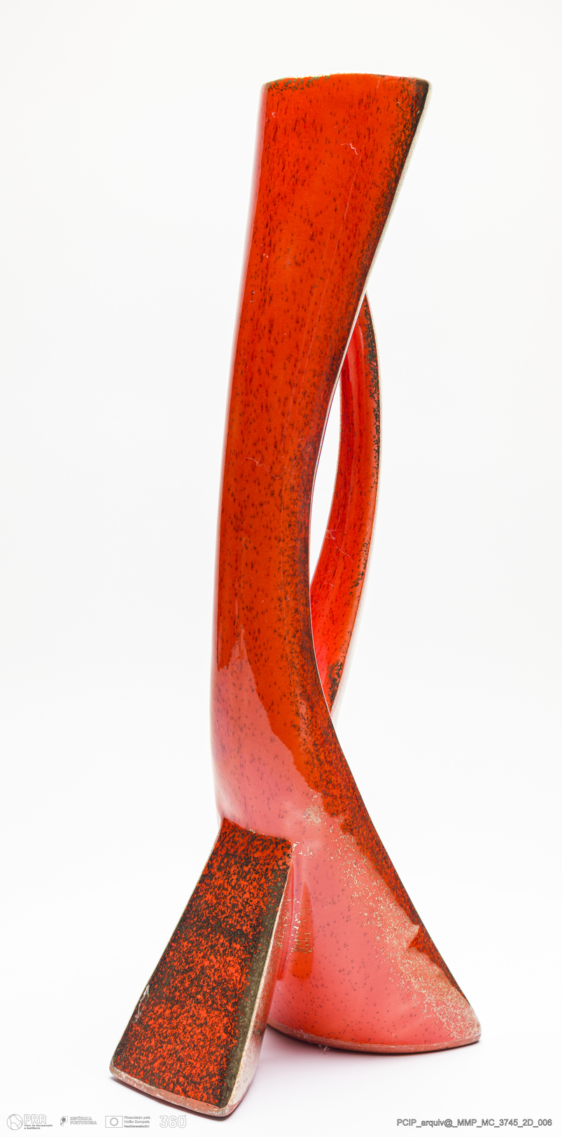 Matéria/Técnica: Barro branco moldado. Vidrado polícromo: vermelho e dourado; Cronologia: século XX; Autoria: Desconhecido / Estados Unidos; Dimensões (cm): Altura: 42; Largura: 12; Comprimento: 17.