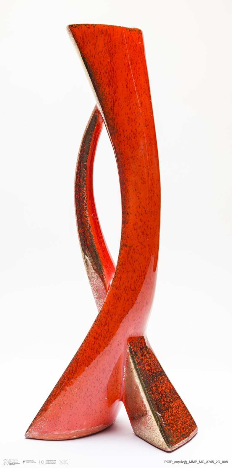 Matéria/Técnica: Barro branco moldado. Vidrado polícromo: vermelho e dourado; Cronologia: século XX; Autoria: Desconhecido / Estados Unidos; Dimensões (cm): Altura: 42; Largura: 12; Comprimento: 17.