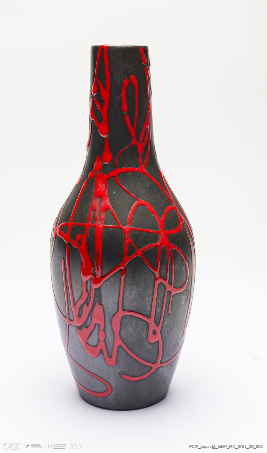 Matéria/Técnica: Barro branco rodado. Vidrado monocromo mate preto e vidrado monocromo vermelho; Cronologia: século XX; Autoria: Desconhecido / Quebec, Canadá; Dimensões (cm): Altura: 26; Diâmetro: 10,5.