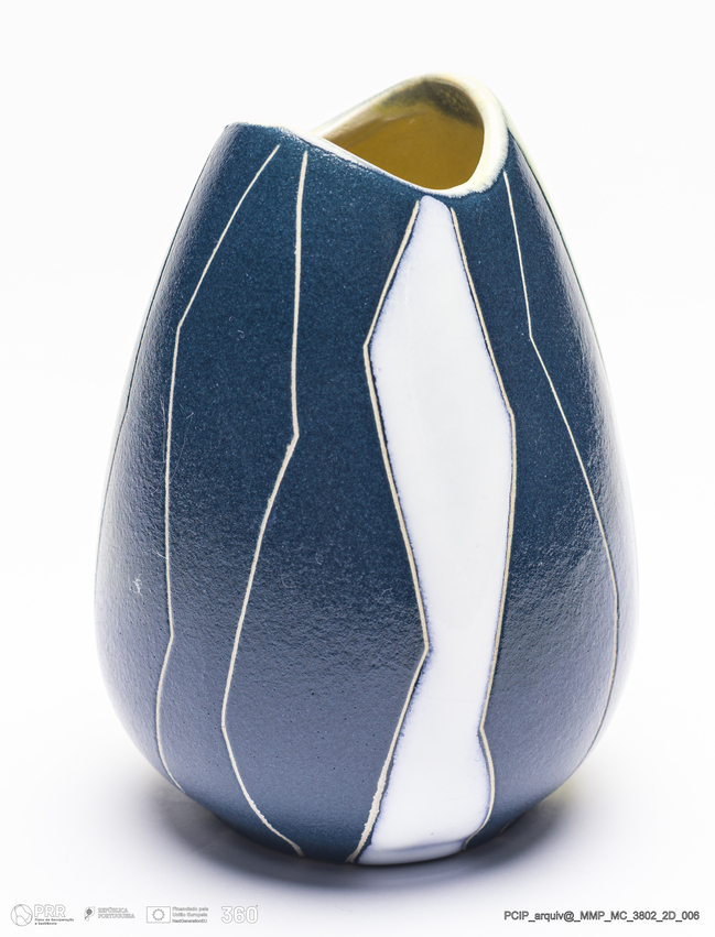 Matéria/Técnica: Barro branco rodado. Vidrado polícromo: azul escuro, amarelo e branco; Cronologia: 1960-1970; Autoria: Desconhecido / Scheurich, Alemanha; Dimensões (cm): Altura: 12,5; Diâmetro: 9.