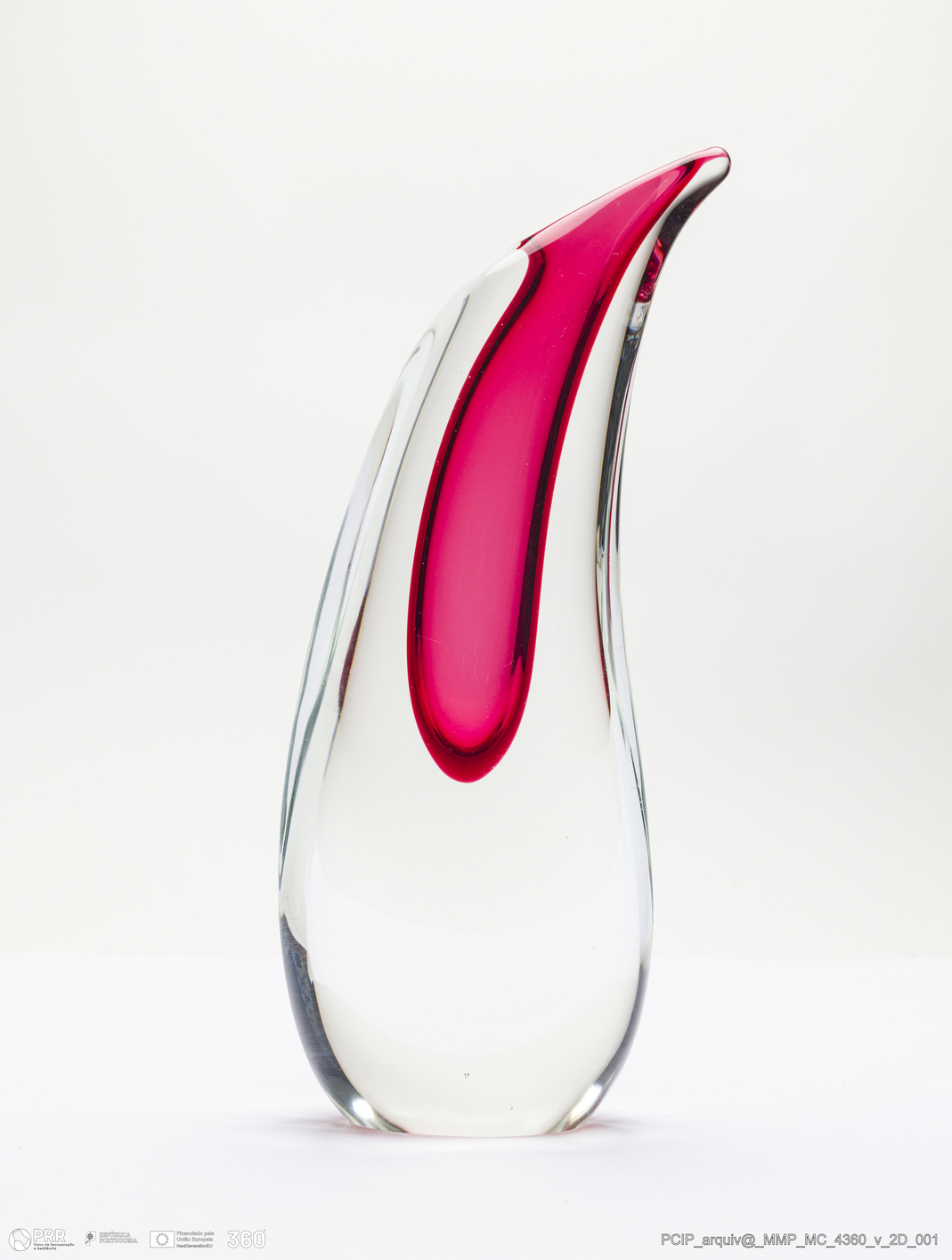Matéria/Técnica: Vidro transparente com rosa; Cronologia: século XX; Autoria: Desconhecido / S.P.M. / Itália; Dimensões (cm): Altura: 22,5; Largura: 3,5; Como 8,5.