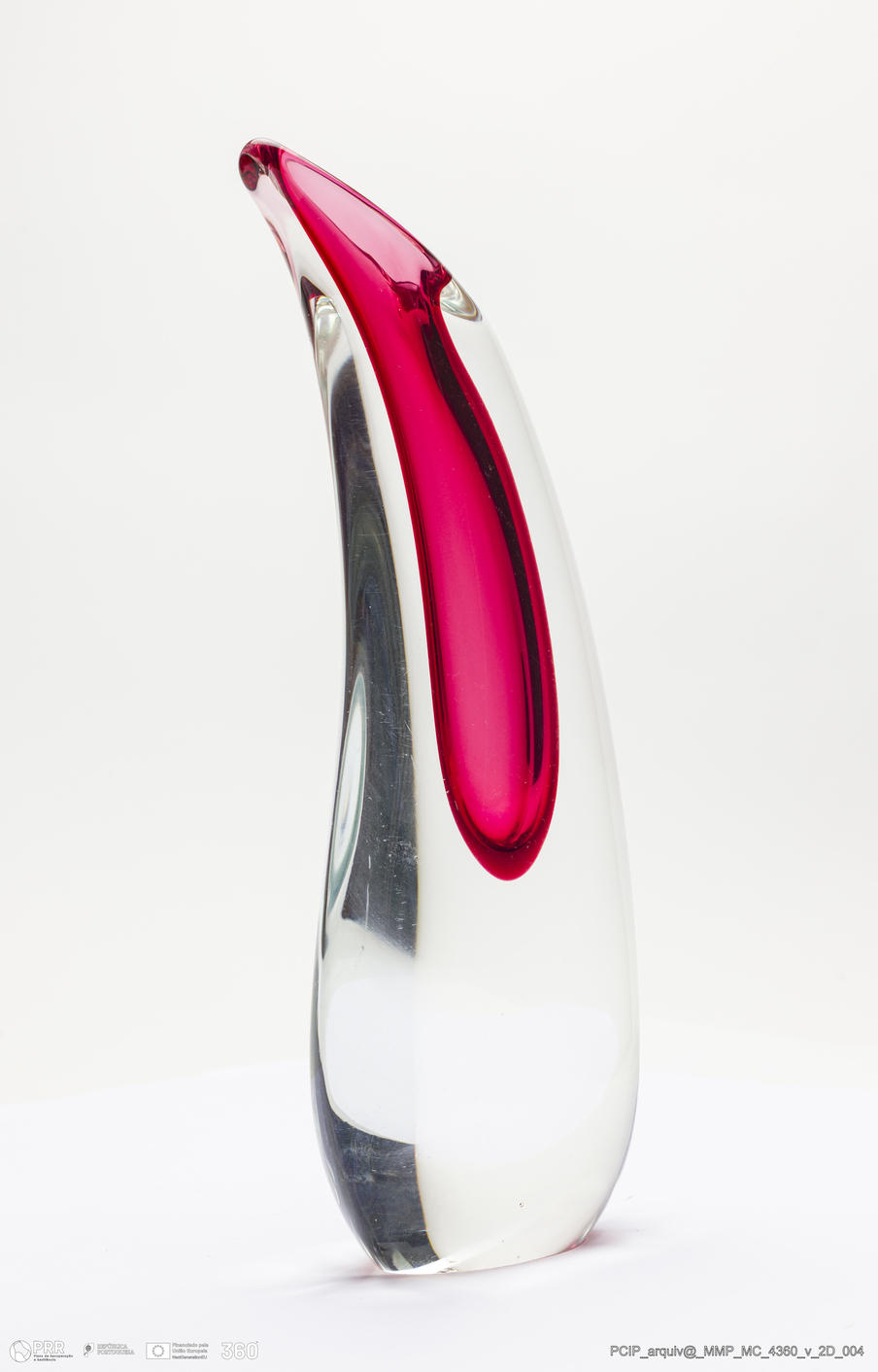 Matéria/Técnica: Vidro transparente com rosa; Cronologia: século XX; Autoria: Desconhecido / S.P.M. / Itália; Dimensões (cm): Altura: 22,5; Largura: 3,5; Como 8,5.