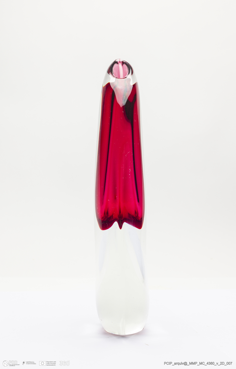 Matéria/Técnica: Vidro transparente com rosa; Cronologia: século XX; Autoria: Desconhecido / S.P.M. / Itália; Dimensões (cm): Altura: 22,5; Largura: 3,5; Como 8,5.
