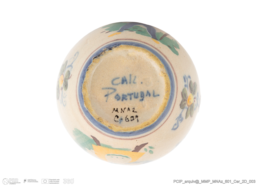 Matéria/Técnica: Estampilha e pintura manual; Cronologia: Século XX; Autoria: Desconhecida; Dimensões: Altura: 14,5 cm x Diâmetro: 10 cm.