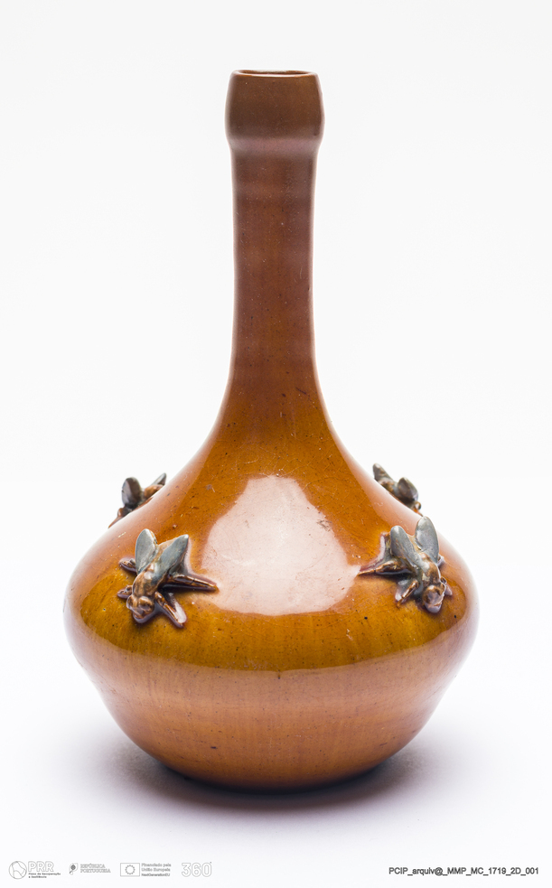 Matéria/Técnica: Barro vermelho rodado e moldado. Vidrado cor de mel, castanho e cinzento; Cronologia: 1909; Autoria: António Augusto da Costa Motta, Fábrica de Faianças das Caldas da Rainha; Dimensões (cm): Altura: 15; Diâmetro: 8.