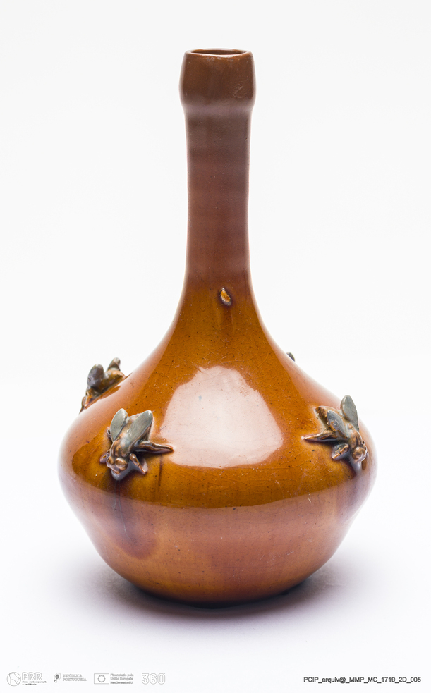 Matéria/Técnica: Barro vermelho rodado e moldado. Vidrado cor de mel, castanho e cinzento; Cronologia: 1909; Autoria: António Augusto da Costa Motta, Fábrica de Faianças das Caldas da Rainha; Dimensões (cm): Altura: 15; Diâmetro: 8.