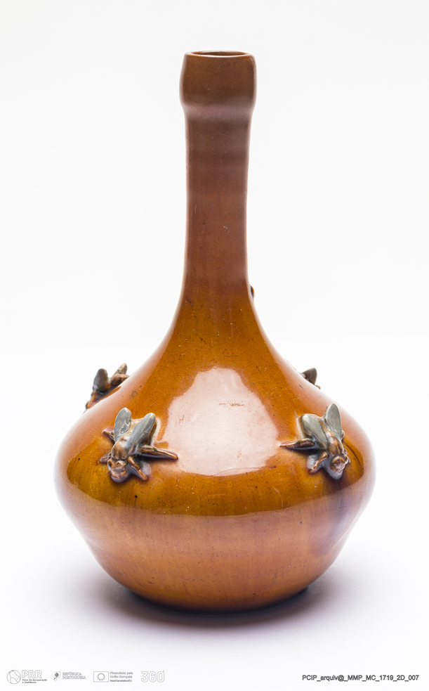 Matéria/Técnica: Barro vermelho rodado e moldado. Vidrado cor de mel, castanho e cinzento; Cronologia: 1909; Autoria: António Augusto da Costa Motta, Fábrica de Faianças das Caldas da Rainha; Dimensões (cm): Altura: 15; Diâmetro: 8.