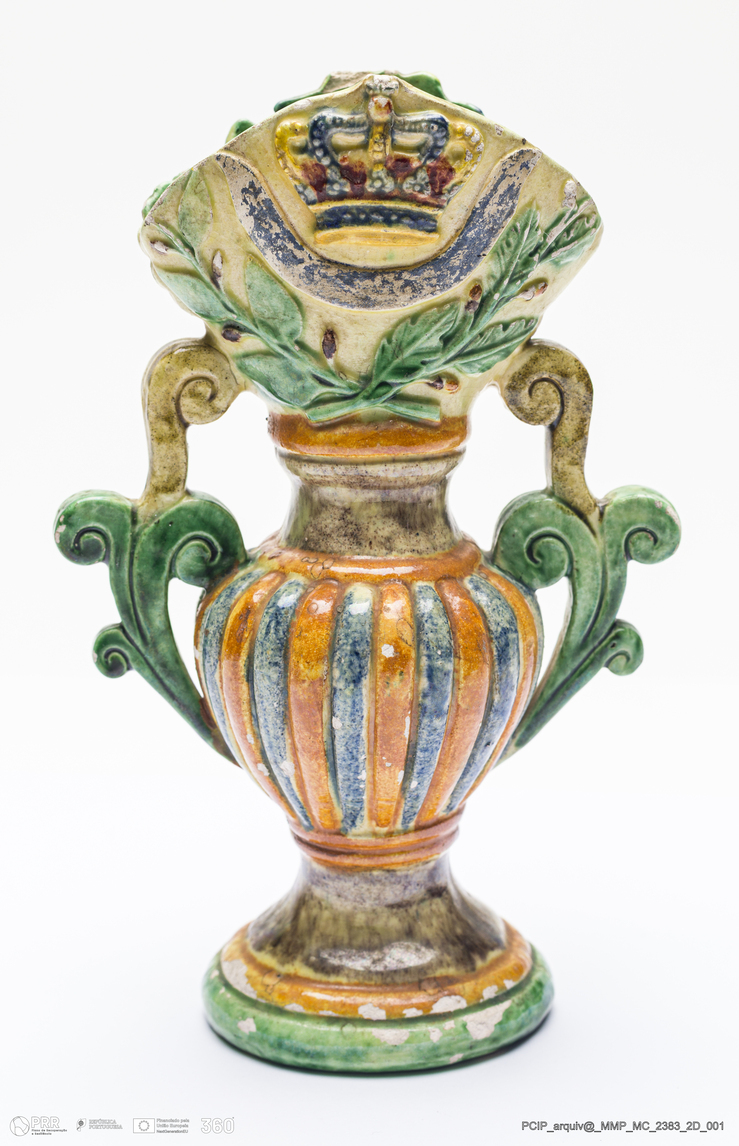Matéria/Técnica: Barro moldado. Vidrado verde, amarelo e castanho; Cronologia: século XIX; Autoria: Atribuído a Manuel Cipriano Gomes Mafra, Caldas da Rainha; Dimensões (cm): Altura: 18.
