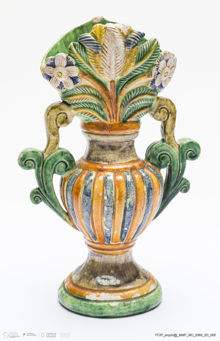 Matéria/Técnica: Barro moldado. Vidrado verde, amarelo e castanho; Cronologia: século XIX; Autoria: Atribuído a Manuel Cipriano Gomes Mafra, Caldas da Rainha; Dimensões (cm): Altura: 18.
