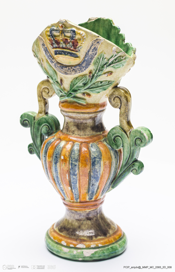 Matéria/Técnica: Barro moldado. Vidrado verde, amarelo e castanho; Cronologia: século XIX; Autoria: Atribuído a Manuel Cipriano Gomes Mafra, Caldas da Rainha; Dimensões (cm): Altura: 18.